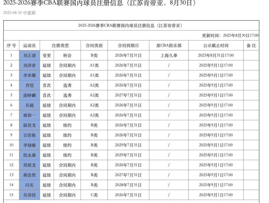 雷速体育8月30日讯 CBA官网今日更新了江苏男篮的15名国内球员注册名单。