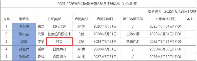 根据CBA官网公布的注册信息,赵睿在北京男篮的注册类型是转会,这说明此前部分媒体人报道的新疆买断赵睿或者新疆和赵睿协商解约都是谣言。